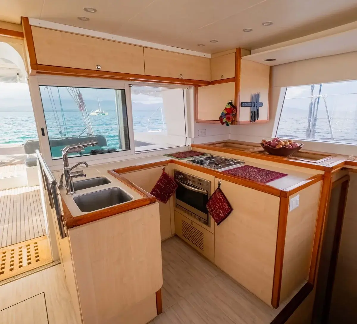 Clan is a 45-foot Lagoon catamaran that has 4 double cabins with en-suite bathrooms for 8 guests.
